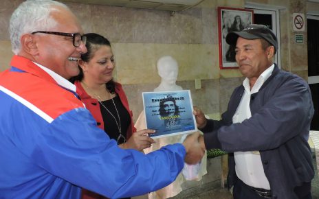 Arelys Casañola Quintana, presidenta de la Asamblea Municipal del Poder Popular, a nombre del pueblo pinero les entregó un gran reconocimiento por el quehacer desarrollado con vista a energizar a ese territorio antes del 30 de septiembre, como digno homenaje al Che y a sus compañeros de lucha en el aniversario 50 de su muerte en tierras bolivianas.