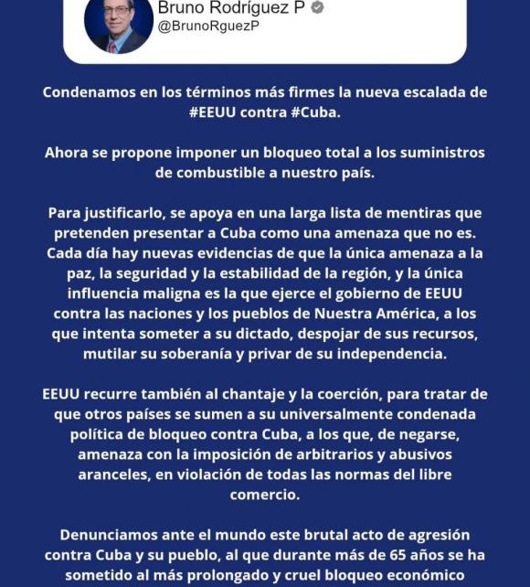 Canciller Bruno Rodríguez en X: Condenamos en los términos más firmes la nueva escalada de #EEUU contra #Cuba. Ahora se propone imponer un bloqueo total a los suministros de combustible a nuestro país. Para justificarlo, se apoya en una larga lista de mentiras que pretenden presentar a Cuba como una amenaza que no es. Cada […]