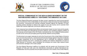El Movimiento también instó a Washington a eliminar las medidas unilaterales adicionales impuestas desde 2017, “incluida la designación unilateral y arbitraria de Cuba como Estado Patrocinador del Terrorismo, que refuerzan el bloqueo y causan enormes pérdidas materiales y daños económicos al pueblo cubano”.