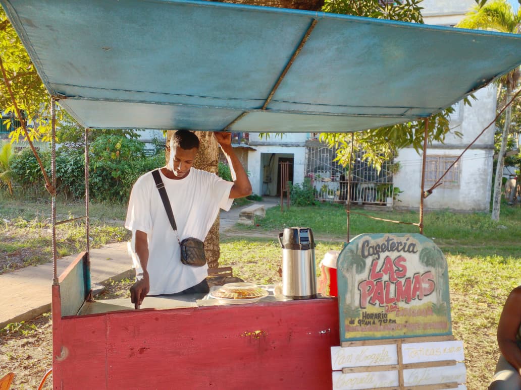Su oferta es la que más conviene a quien va de paso y los vecinos del barrio: croqueta frita a 35 pesos, con pan a 80; a 80 también el pan con salchicha, la tortica a 50, pan con mantequilla a 70 al igual que el pudín de coco, refresco y café a 20…