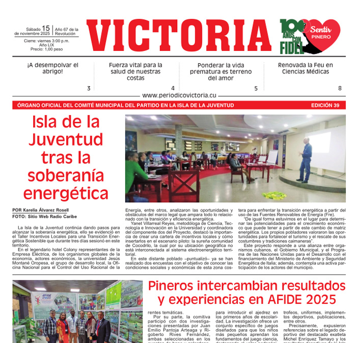 Edición impresa No 59-39/15-11-2025 Posted on 15 noviembre, 202514 noviembre, 2025 Autor Redacción Digital No comentarios(0) Edición Impresa No. 59-39 Otros artículos del autor: Generación eléctrica en la Isla: desafíos, averías y planes de recuperación Cinco pineros representarán a la ANCI en su IX Congreso Solidaridad pinera con la región oriental tras el paso de Melissa (+Fotos) Catamarán V2V Empress operará hacia Isla de la Juventud Edición del año 59 Ediciones Impresas