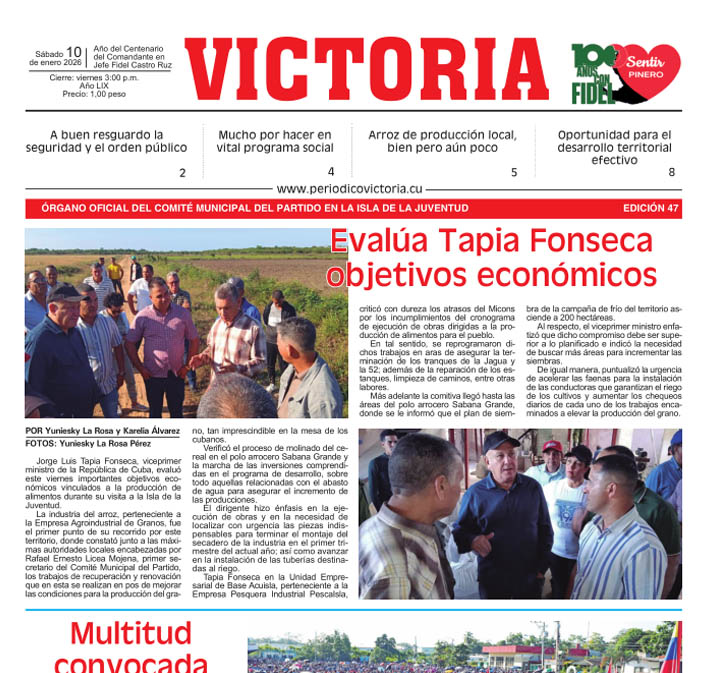 Edición impresa No 59-47/10-01-2026 Posted on 10 enero, 20269 enero, 2026 Autor Redacción Digital No comentarios(0) Edición Impresa No. 59-46 Otros artículos del autor: Pineros desarrollan la soya como opción sostenible y nutritiva Rememoran pineros Operación Tributo a los mártires de la Patria(+Fotos) Instan a iniciativas de transición hacia fuentes renovables de energía Refuerzan preparación de órganos locales en Isla de la Juventud Edición del año 59 Ediciones Impresas