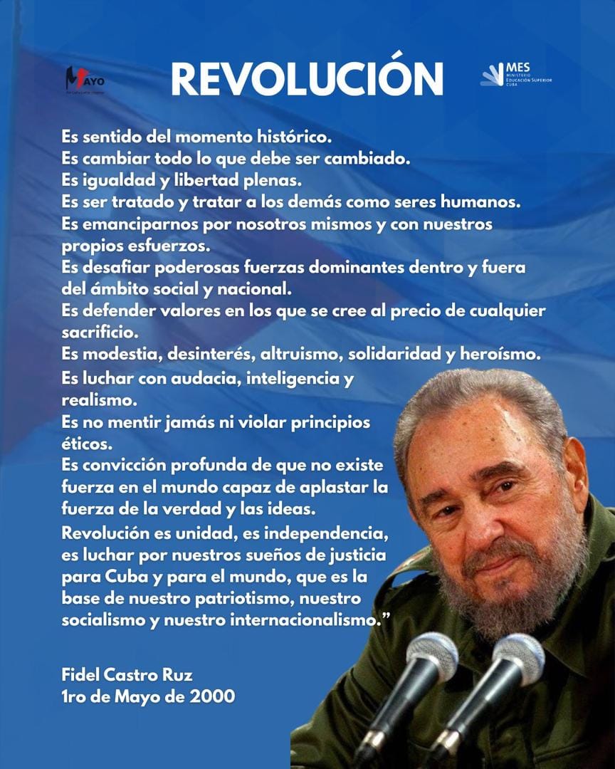 (Revolución) “es convicción profunda de que no existe fuerza en el mundo capaz de aplastar la fuerza de la verdad y las ideas. Revolución es unidad, es independencia, es luchar por nuestros sueños de justicia para Cuba y para el mundo, que es la base de nuestro patriotismo, nuestro socialismo y nuestro internacionalismo”.