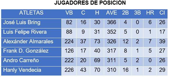 Los nuestros acumularon números muy bajos, en ninguno de los aspectos ofensivos mostraron una actuación ni cercana a lo regular. En ocasiones una buena actuación monticular no contó con el respaldo ofensivo y viceversa, pues no se pudieron conjugar esos dos elementos, en otras la defensa echaba por tierra la buena faena del lanzador y la producción ofensiva.