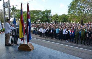 Banderas cubana y del 26 de Julio escoltaron el homenaje devenido tribuna de repudio a los sucesos acaecidos en la hermana nación y que cobraran las vidas de más de un centenar de personas.