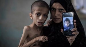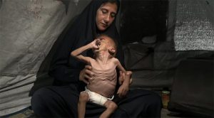 Hidayat Al-Motawaq sostiene a su hijo de 18 meses, Mohammad Al-Motawaq, en su tienda de campaña en la Franja de Gaza. Agosto de 2025. Foto: NPR.Nafez Mohammed Khidr Nasser, de 10 años, carece de alimentos y medicinas básicas y sufre de desnutrición en el barrio de Tuffah, Ciudad de Gaza. Ha perdido la capacidad de caminar y su peso ha disminuido rápidamente. Foto: Getty/ Tomada de LA Times.