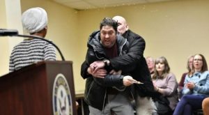 Después de que el miembro de seguridad redujera en el suelo al agresor, se escucha a varias personas en el público exclamando con preocupación mientras la congresista hace señas de querer continuar hablando.