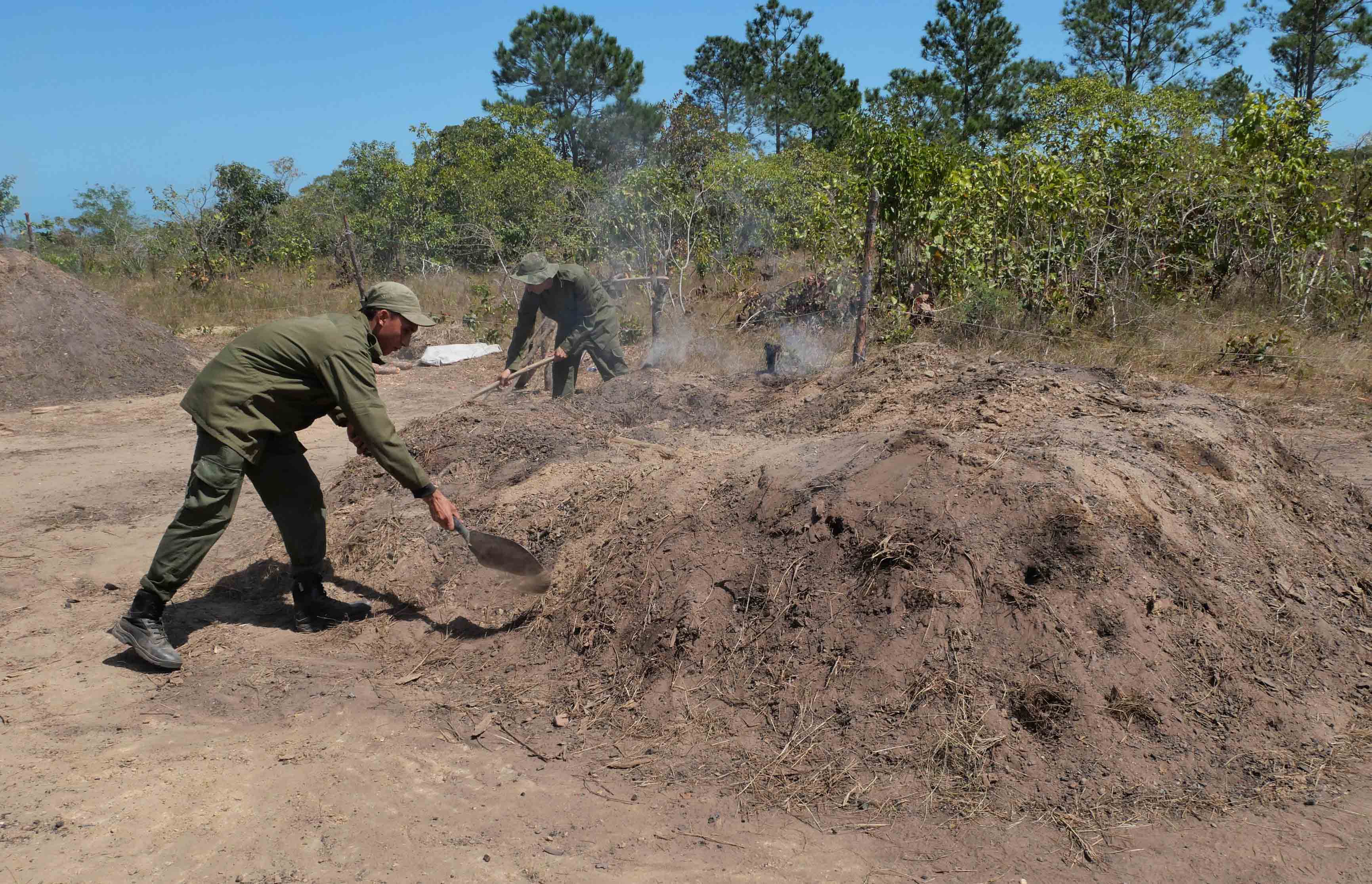 “Por una indicación de la jefatura del Sector Militar –explicó Mangana Armas– se nos dio la tarea de conformar en primer lugar una brigada de combatientes y decidimos escoger a muchachos con experiencia acumulada en estas labores. Aprovechamos el marabú de las áreas aledañas a nuestra unidad militar para montar los hornos y con los cuatro primeros hemos logrado satisfacer las necesidades de 148 compañeros.
