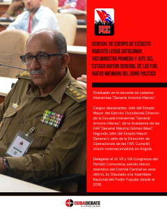 Los integrantes del CC PCC promovieron en su XI Pleno al general de Cuerpo de Ejército, Roberto Legrá Sotolongo, viceministro primero y jefe del Estado Mayor General de las Fuerzas Armadas Revolucionarias desde 2021, a miembro del Buró Político de la Organización.