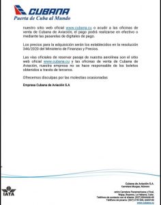 “Para realizar la compra de boletos los clientes deben acceder a nuestro sitio web oficial www.cubana.cu o acudir a las oficinas de venta de Cubana de Aviación, el pago podrá realizarse en efectivo o mediante las pasarelas de digitales de pago”, indicó la fuente.
