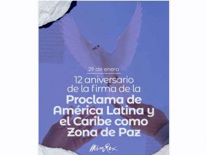 En X, el titular de exteriores de la isla, recordó cuando durante la Segunda Cumbre de la Comunidad de Estados Latinoamericanos y del Caribe (Celac), 33 mandatarios reunidos en esta capital firmaron la Proclama de América Latina y el Caribe como Zona de Paz.