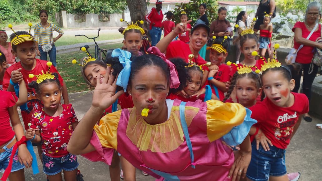 Las Abejitas Sucusuqueras con la payasita Melcocha (instructora de teatro Yalina Pérez Pelegrín) fueron centro del espectáculo infantil que dio inicio a la Semana de la Victoria en La Fe.