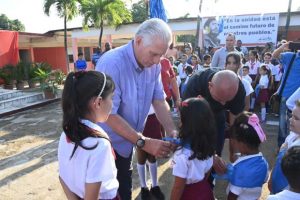 En Chambas, municipio ubicado a más de 60 kilómetros de la ciudad de Ciego de Ávila, comenzó su recorrido por la provincia este miércoles el primer secretario del Comité Central del Partido Comunista de Cuba y presidente de la República, Miguel Díaz-Canel Bermúdez. Allí, el mandatario visitó la escuela primaria “Antonio Maceo”, donde 88 niños de primer grado, como es tradición en todo el país, recibieron la pañoleta azul que los inicia como pioneros.