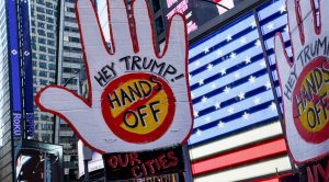Cartel en forma de mano en la ciudad de Nueva York, “Trump, manos fuera de nuestras ciudades”. Uno de los detonantes de las manifestaciones No Kings ha sido el envío de tropas de la Guardia Nacional a las ciudades en contra de la voluntad de las autoridades y poblaciones locales. Foto: Reuters.