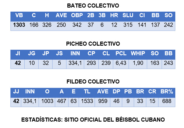 Por ejemplo, a la ofensiva el line up de la Isla se ha ponchado en 242 oportunidades y han negociado 137 boletos gratis hacia la inicial; el staff de picheo, por su parte, ha retirado por la vía de los strikes a 163 oponentes mientras han regalado 243 bases por bolas.
