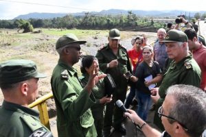 Luego Díaz-Canel se trasladó a Sagua de Tánamo, otro de los municipios holguineros golpeados por la furia del huracán. Estuvo en el puente sobre el río Sagua, que resistió la gran crecida, pero donde colapsaron tres pozos de agua, ubicados en sus márgenes.