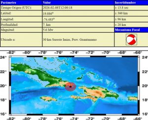 Hasta el momento se han recibido reportes de perceptibilidad varias localidades de las provincias de Guantánamo, Santiago de Cuba y Granma. Hora de cierre 08:00 am, 8 de febrero de 2026. Este es el sismo perceptible No 02 del año.