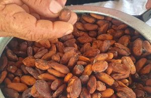 Al concluir el proceso, el campesino de baja estatura muestra con orgullo cómo, al conservar la manteca, el cacao se transforma en un bloque compacto que puede derretirse al baño María —método de cocción— para elaborar bombones, una vez mezclado con azúcar, molido varias veces e integrado en una masa suave que se coloca en moldes y se enfría.