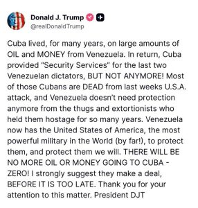 En una nueva escalada de su retórica y medidas anticubanas, el presidente Donald Trump dijo en su red social que no habrá más petróleo y dinero de Venezuela para Cuba, olvidando el carácter soberano de ambas naciones latinoamericanas.